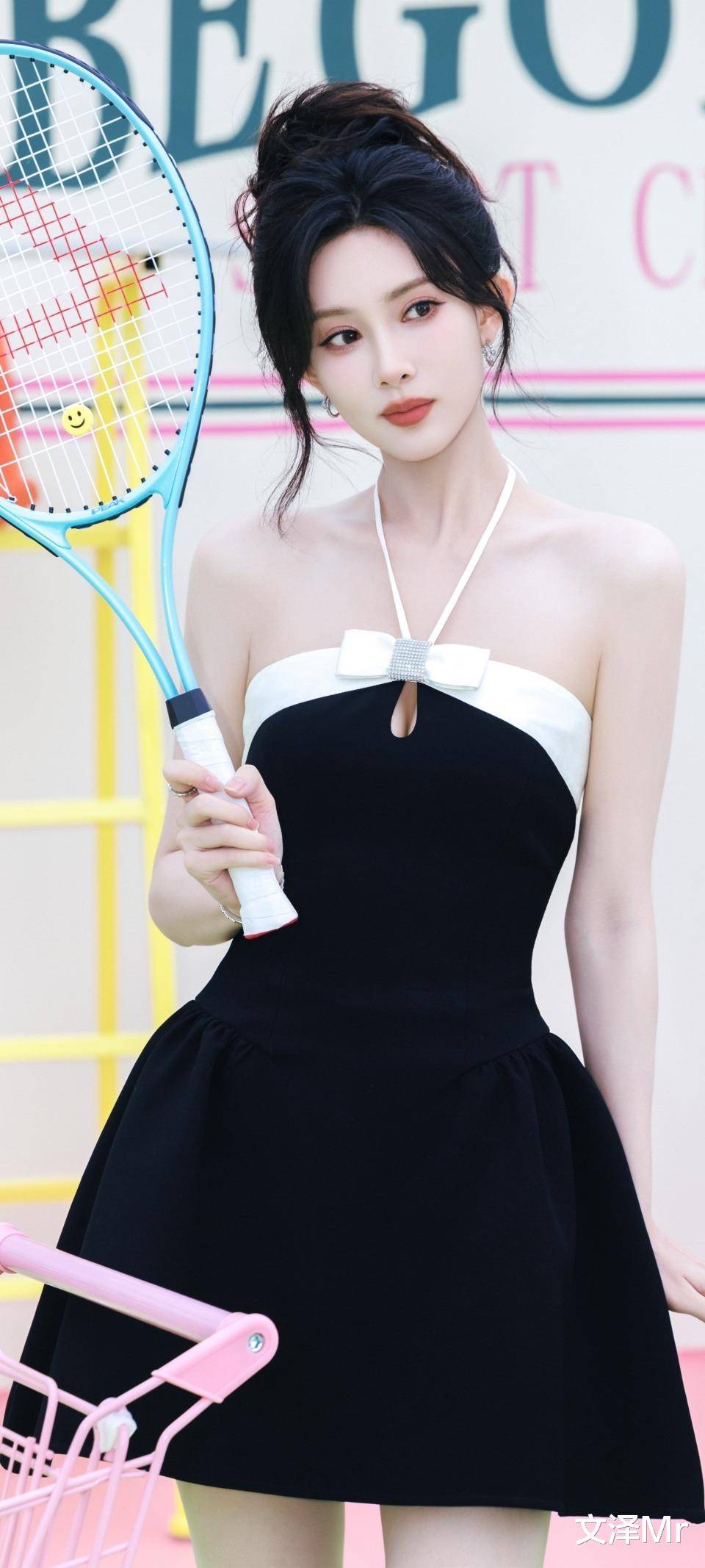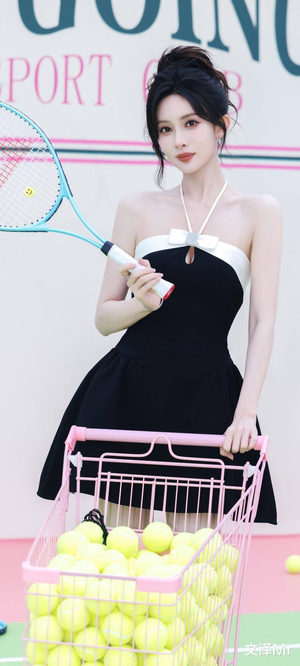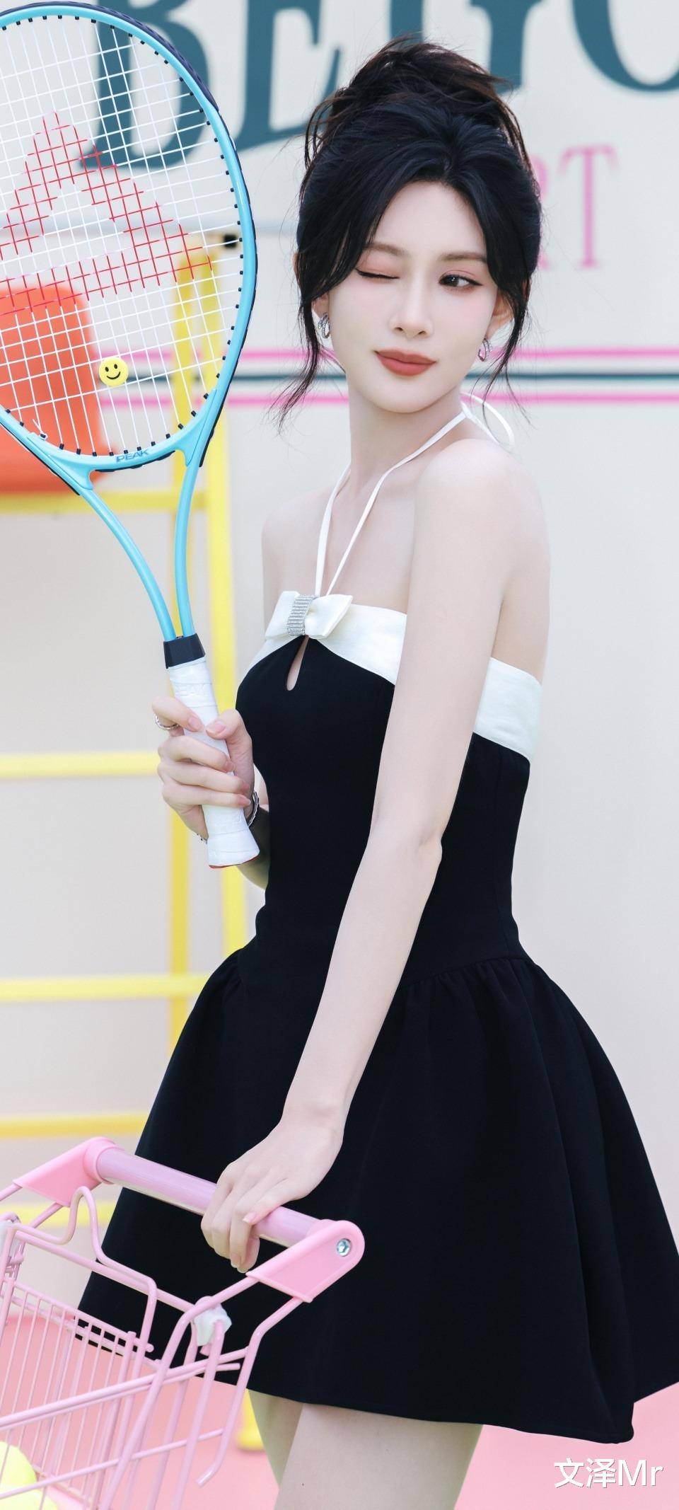 快门捕捉到的眨眼瞬间堪称神来之笔!蓝白球拍上咧着嘴的笑脸贴纸,与主人唇角漾起的梨涡上演甜蜜二重奏。黑色抹胸裙的纯白蝴蝶结领口宛若雪地里的黑天鹅,将甜酷这对反义词熔铸成独树一帜的孟式反差美学。粉丝们疯狂截图的何止是画面,更是那份把运动器械变成高定配饰的鬼马创意。